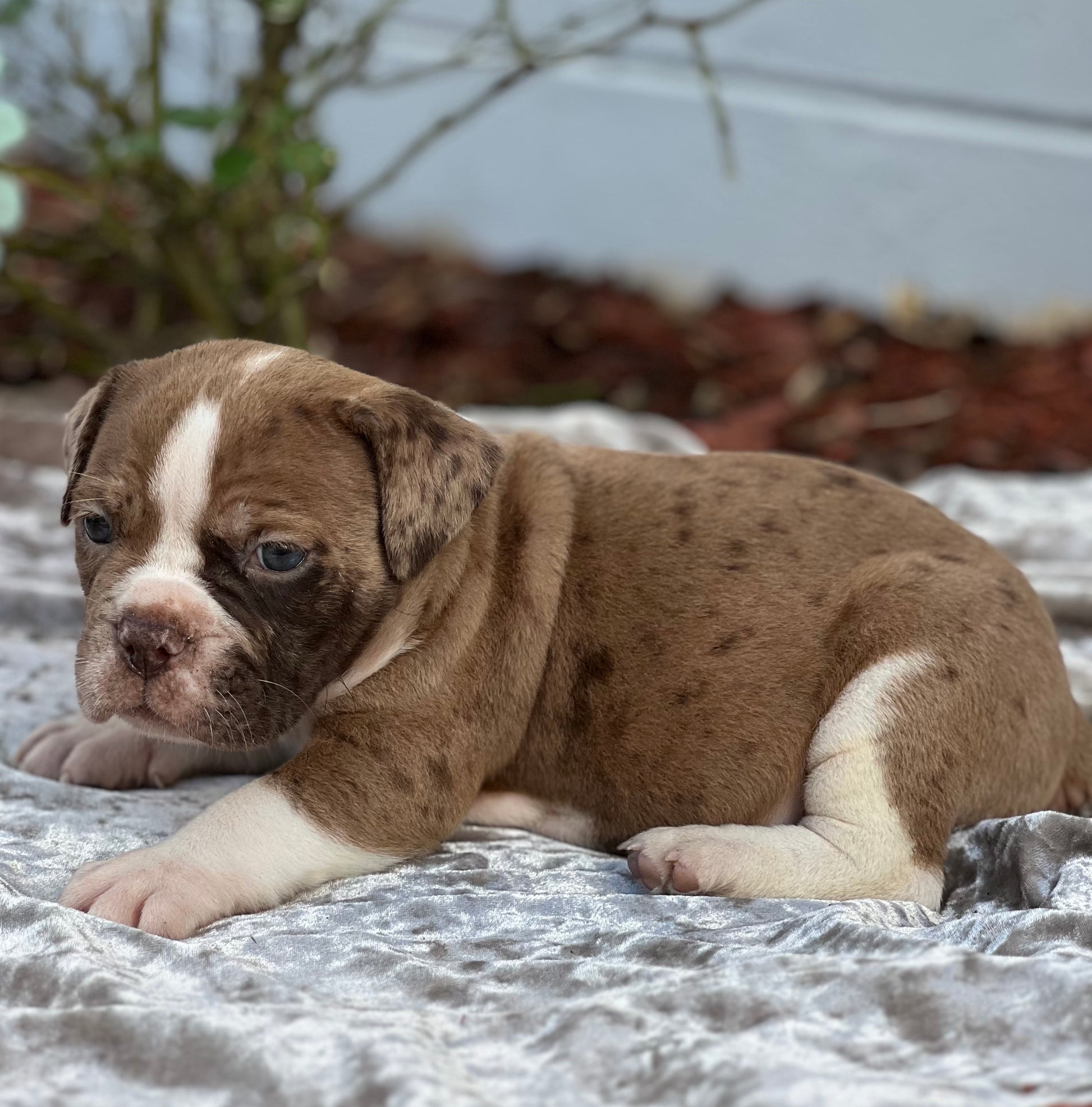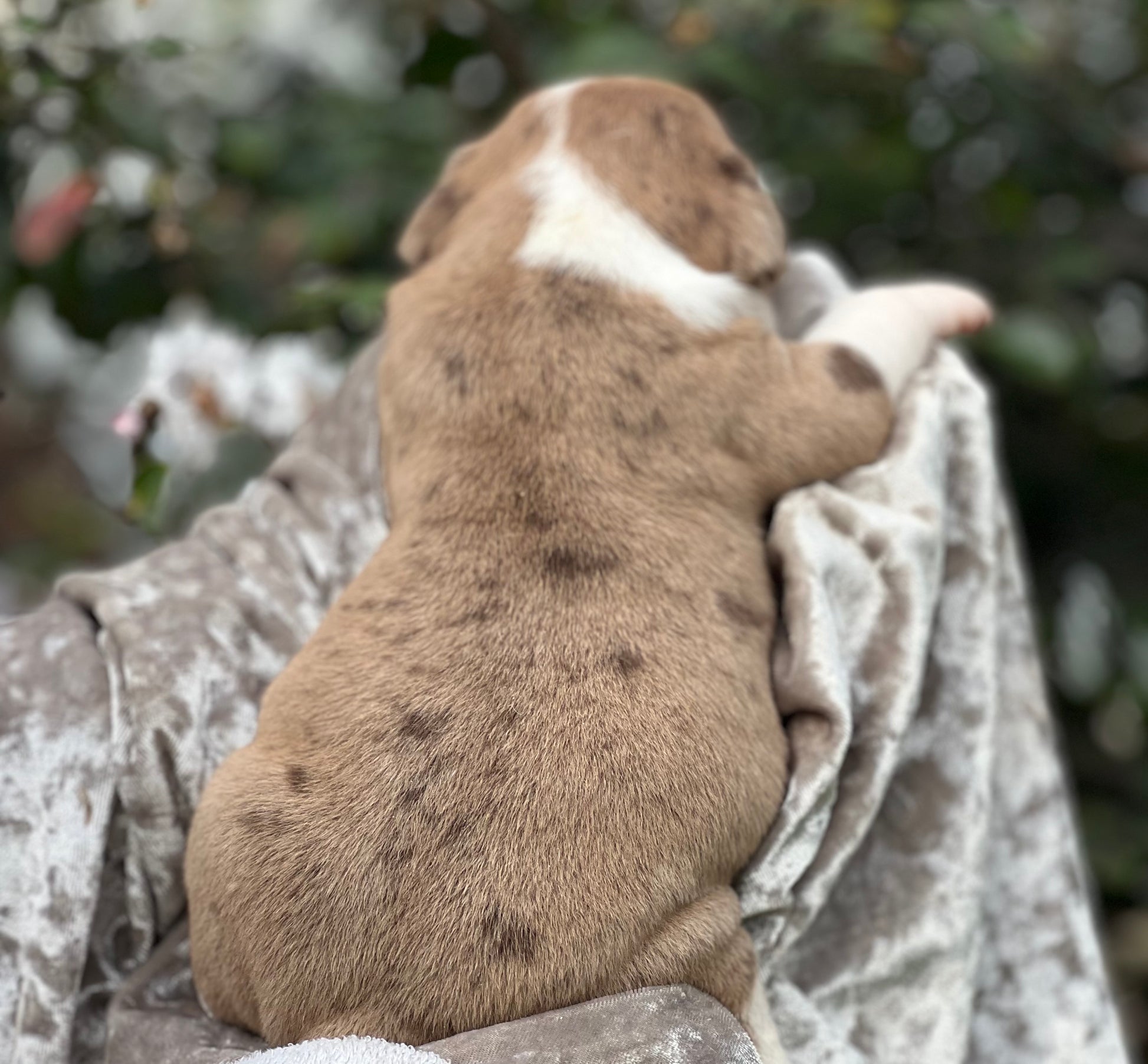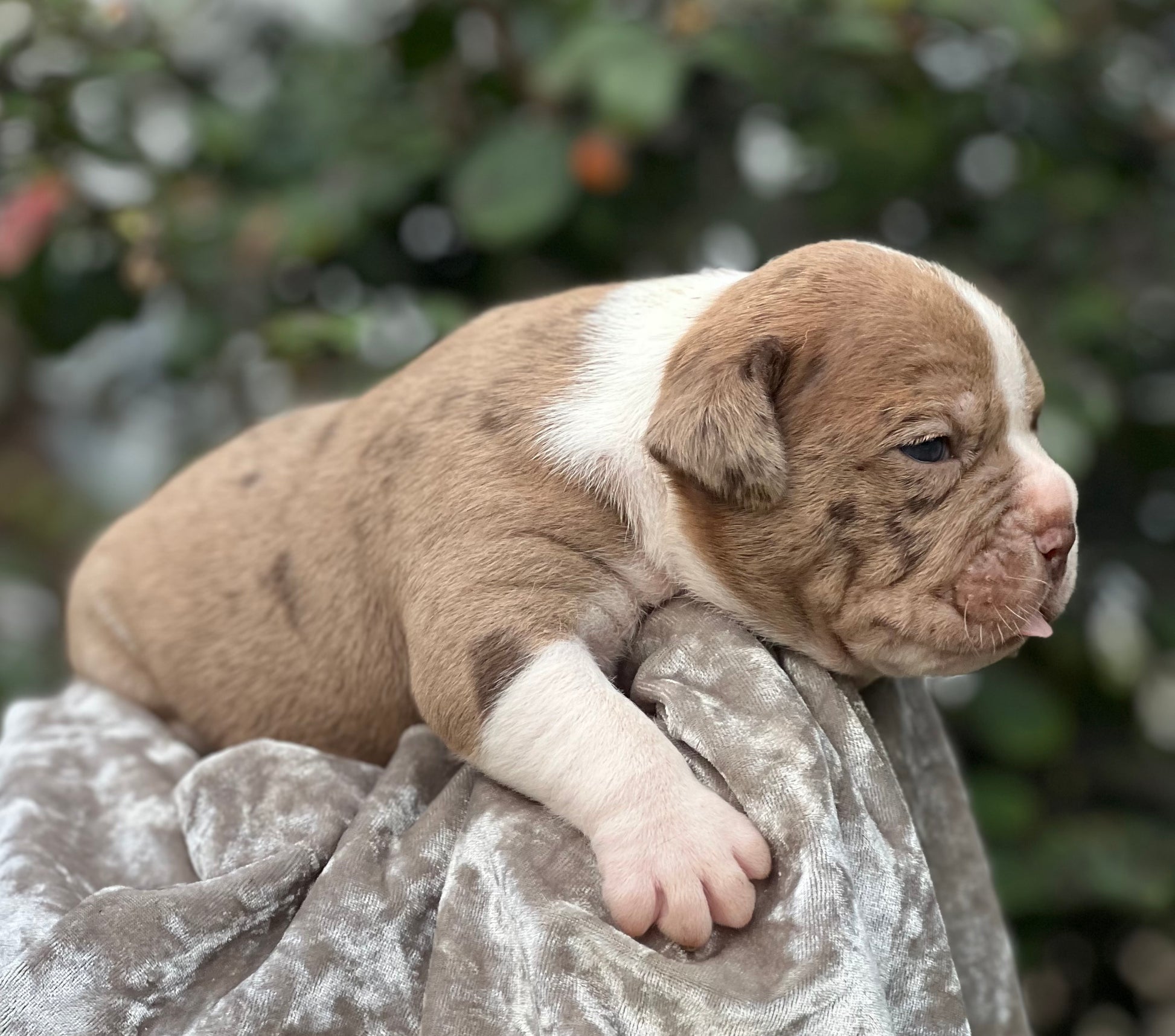 ASHER is a CHOCOLATE MERLE Male puppy by BHB BLINKZ x BHB BINGO born 8-16-2025. Purchase includes first shots, wormed 7 times, ABKC 5 generation registration papers, microchipped, FL health certificate, negative fecal, and 1-year health guarantee, 1 month FREE Tropanion Pet Insurance, 24/7 lifetime support, and training advice. WE CAN DELIVER ANYWHERE WORLDWIDE WITH A FEE . Contact us for a video of ASHER.