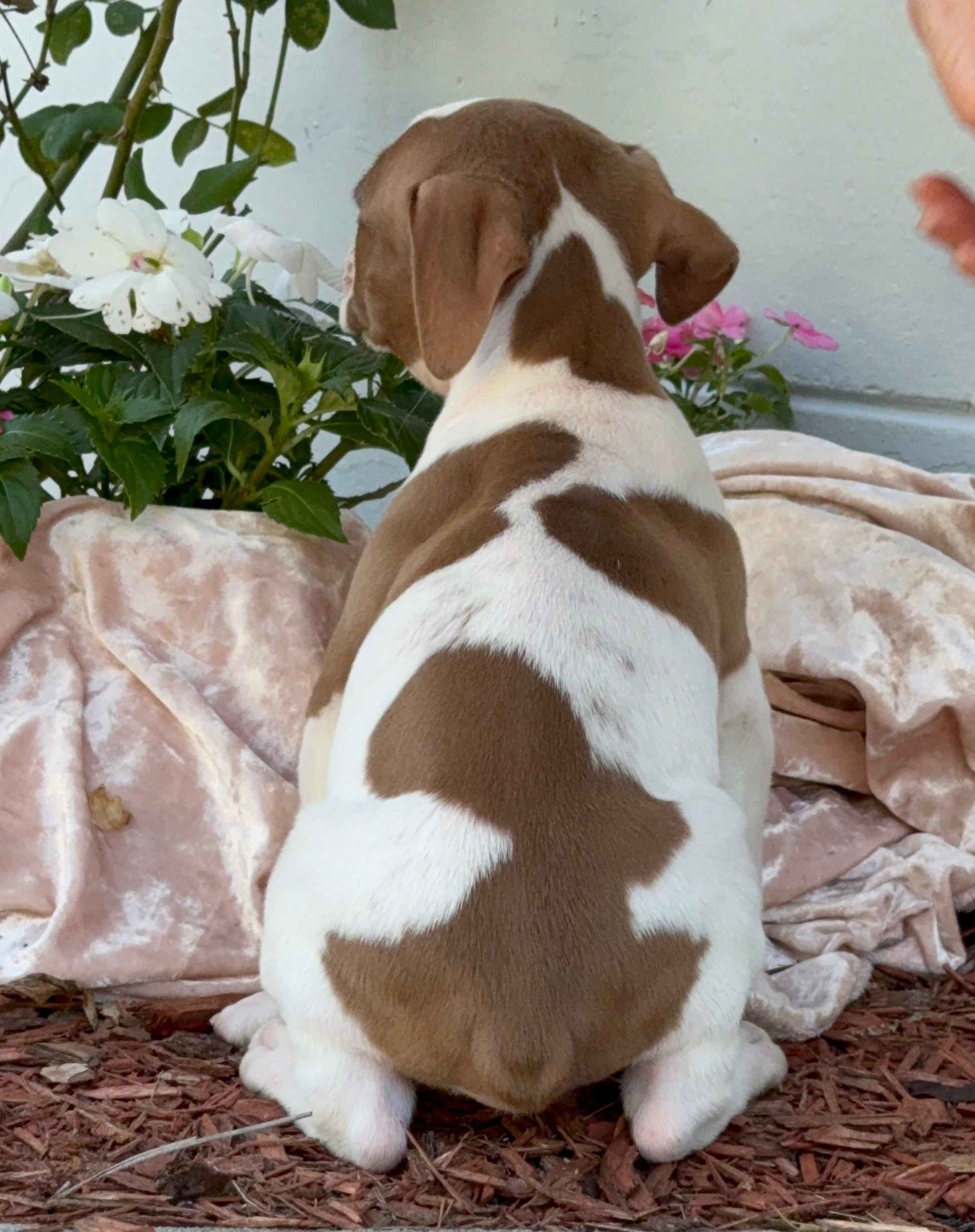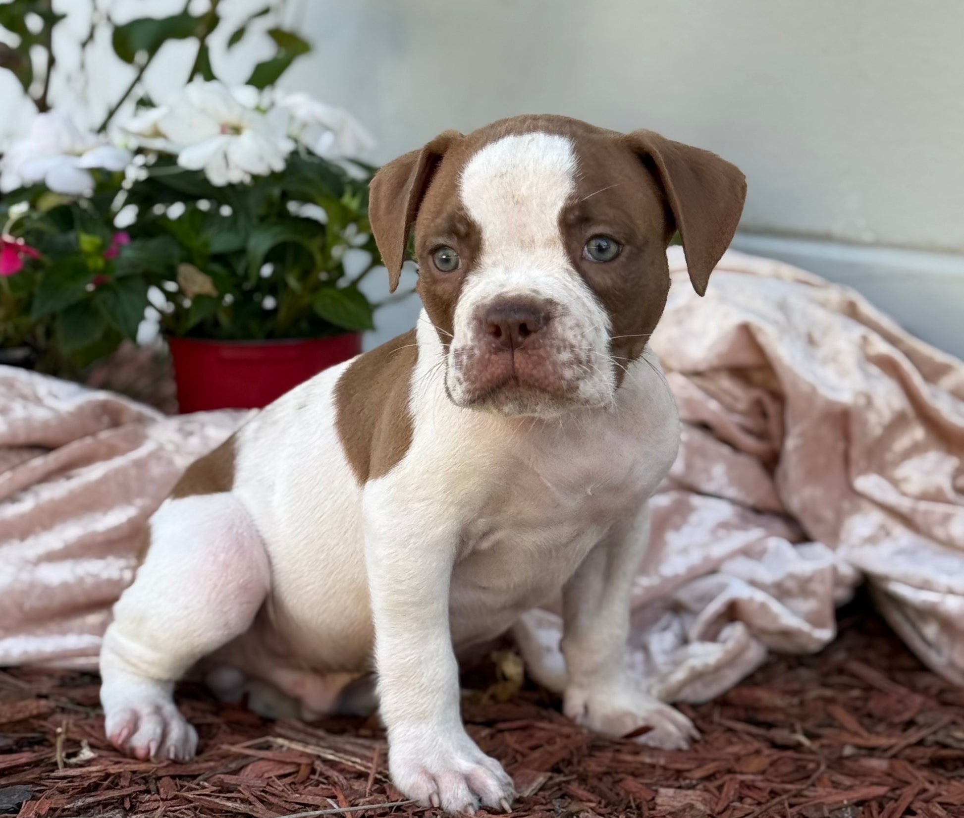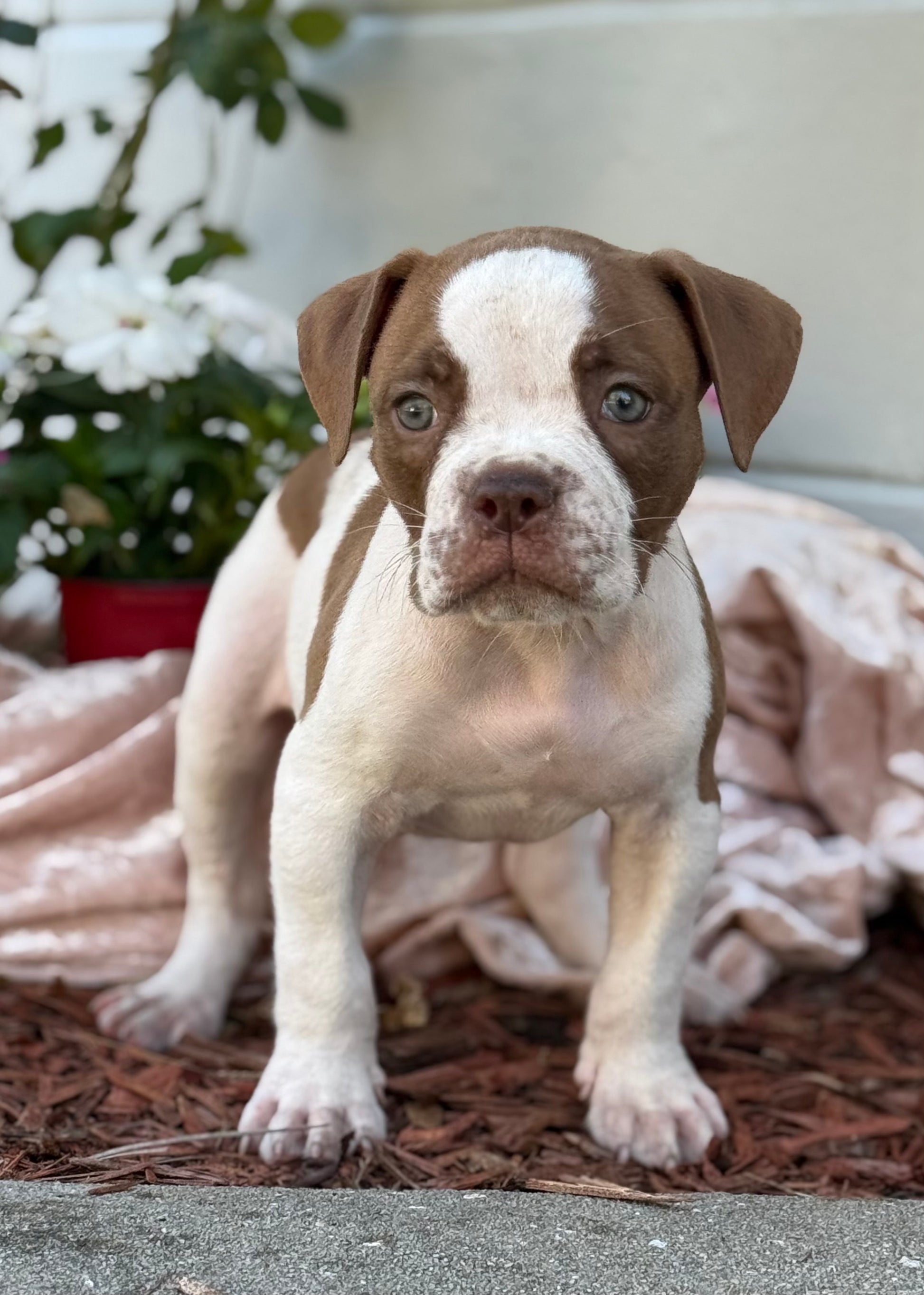 FRANKIE is a CHOCOLATE PIED Male puppy by BHB CH THYRA x BHB MR. KNUCKLES, born 10-3-2025. Purchase includes first shots, wormed 7 times, ABKC 5 generation registration papers, microchipped, FL health certificate, negative fecal, and 1-year health guarantee, 1 month FREE Tropanion Pet Insurance, 24/7 lifetime support, and training advice. WE CAN DELIVER ANYWHERE WORLDWIDE WITH A FEE . Contact us for a video of FRANKIE.