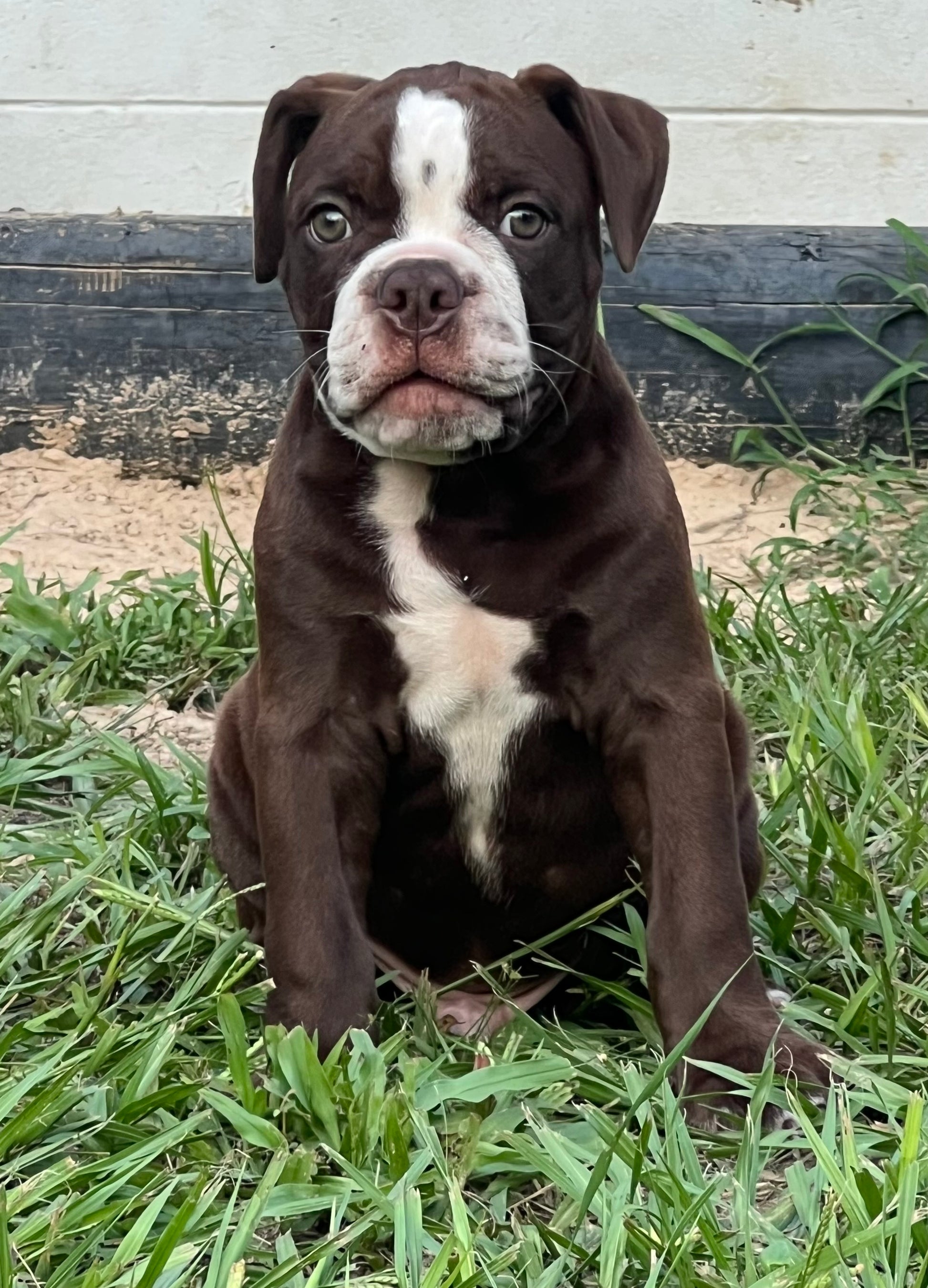 MYER is a CHOCOLATE AND WHITE Male puppy by BHB SADIE x BHB CHAMPION BRINKZ JR born 6-1-2025. Purchase includes first shots, wormed 7 times, ABKC 5 generation registration papers, microchipped, FL health certificate, negative fecal, and 1-year health guarantee, 1 month FREE Tropanion Pet Insurance, 24/7 lifetime support, and training advice. WE CAN DELIVER ANYWHERE WORLDWIDE WITH A FEE . Contact us for a video of MYER.