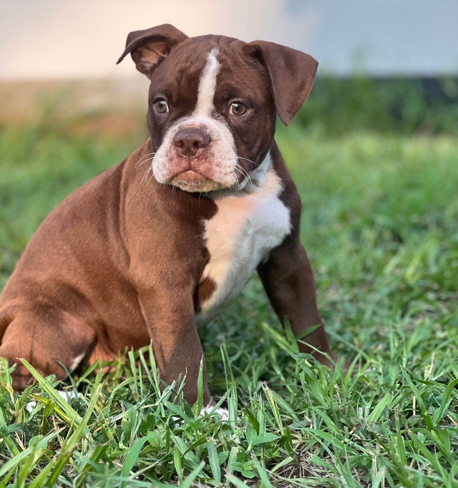 NORTON is a CHOCOLATE AND WHITE Male puppy by BHB SADIE x BHB CHAMPION BRINKZ JR born 6-1-2025. Purchase includes first shots, wormed 7 times, ABKC 5 generation registration papers, microchipped, FL health certificate, negative fecal, and 1-year health guarantee, 1 month FREE Tropanion Pet Insurance, 24/7 lifetime support, and training advice. WE CAN DELIVER ANYWHERE WORLDWIDE WITH A FEE . Contact us for a video of NORTON.