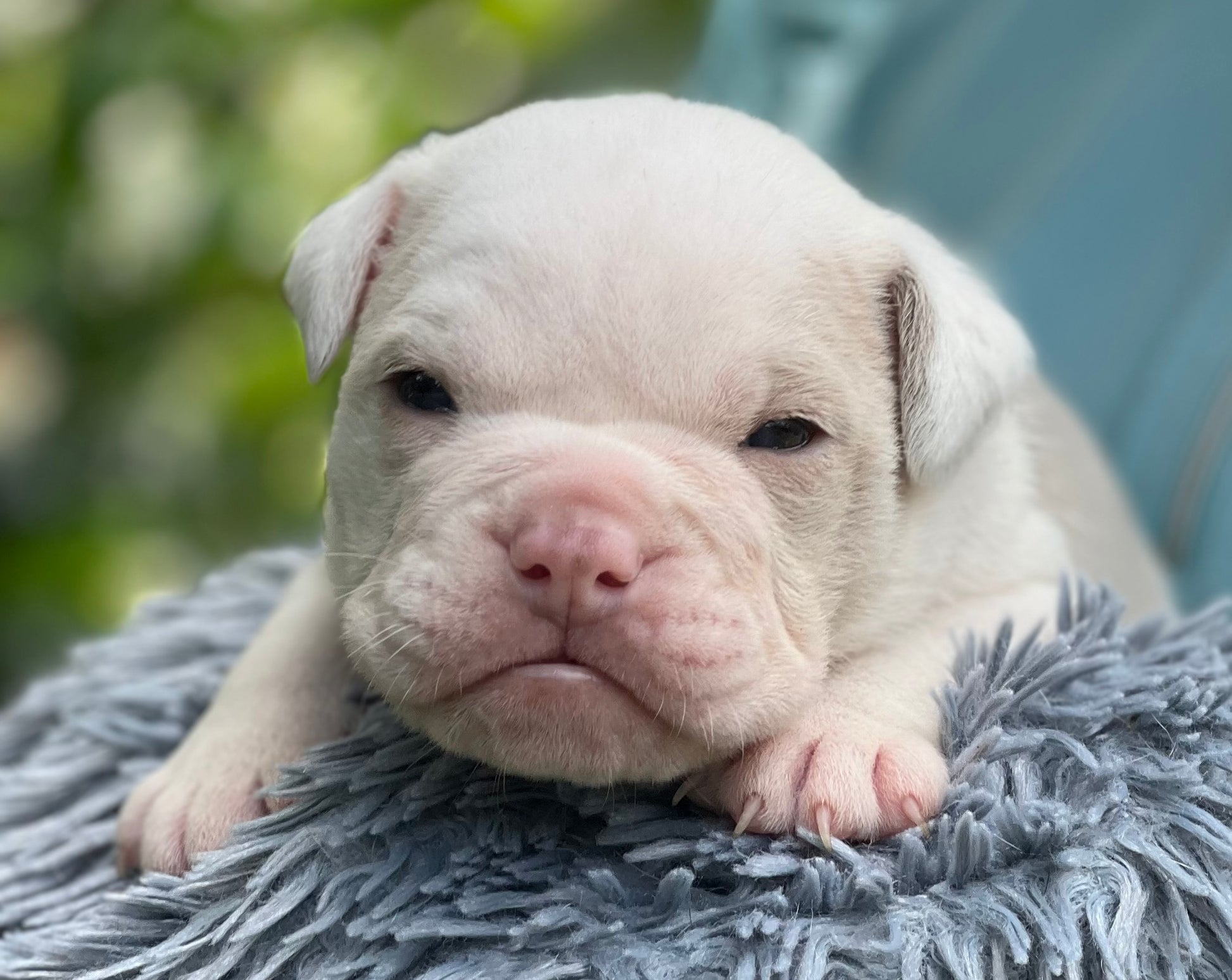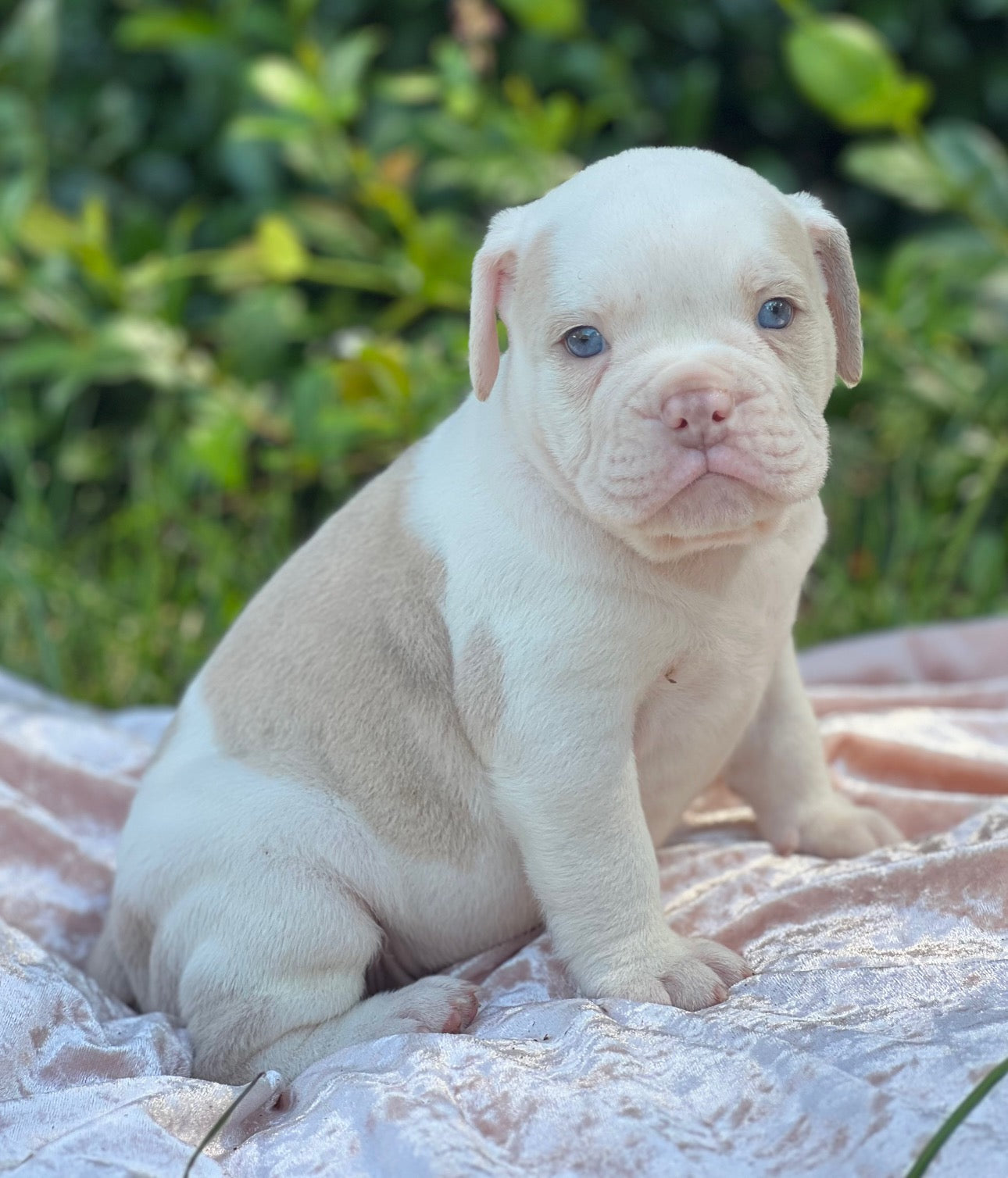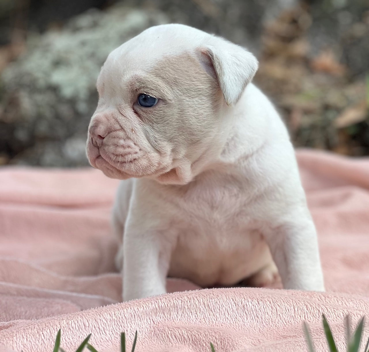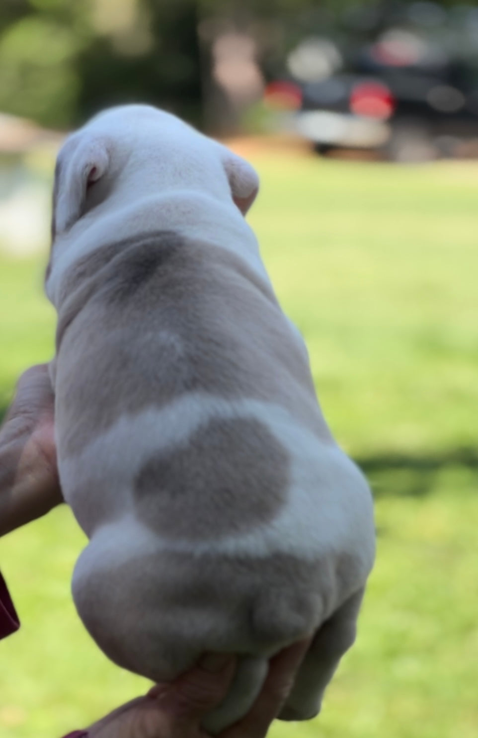 RAZZLE is a LILAC MERLE Male puppy by BHB CINDERBLOCK and BHB MR. CAPTAIN. born 5-19-24. Purchase includes first shots, wormed 7 times, ABKC 5 generation registration papers, microchipped, FL health certificate, negative fecal, and 1-year health guarantee, 1 month FREE Tropanion Pet Insurance, 24/7 lifetime support, and training advice. WE CAN DELIVER ANYWHERE WORLDWIDE WITH A FEE. Contact us for a video of RAZZLE. This beautiful Merle boy comes with a heart in his coat as well as blue eyes.